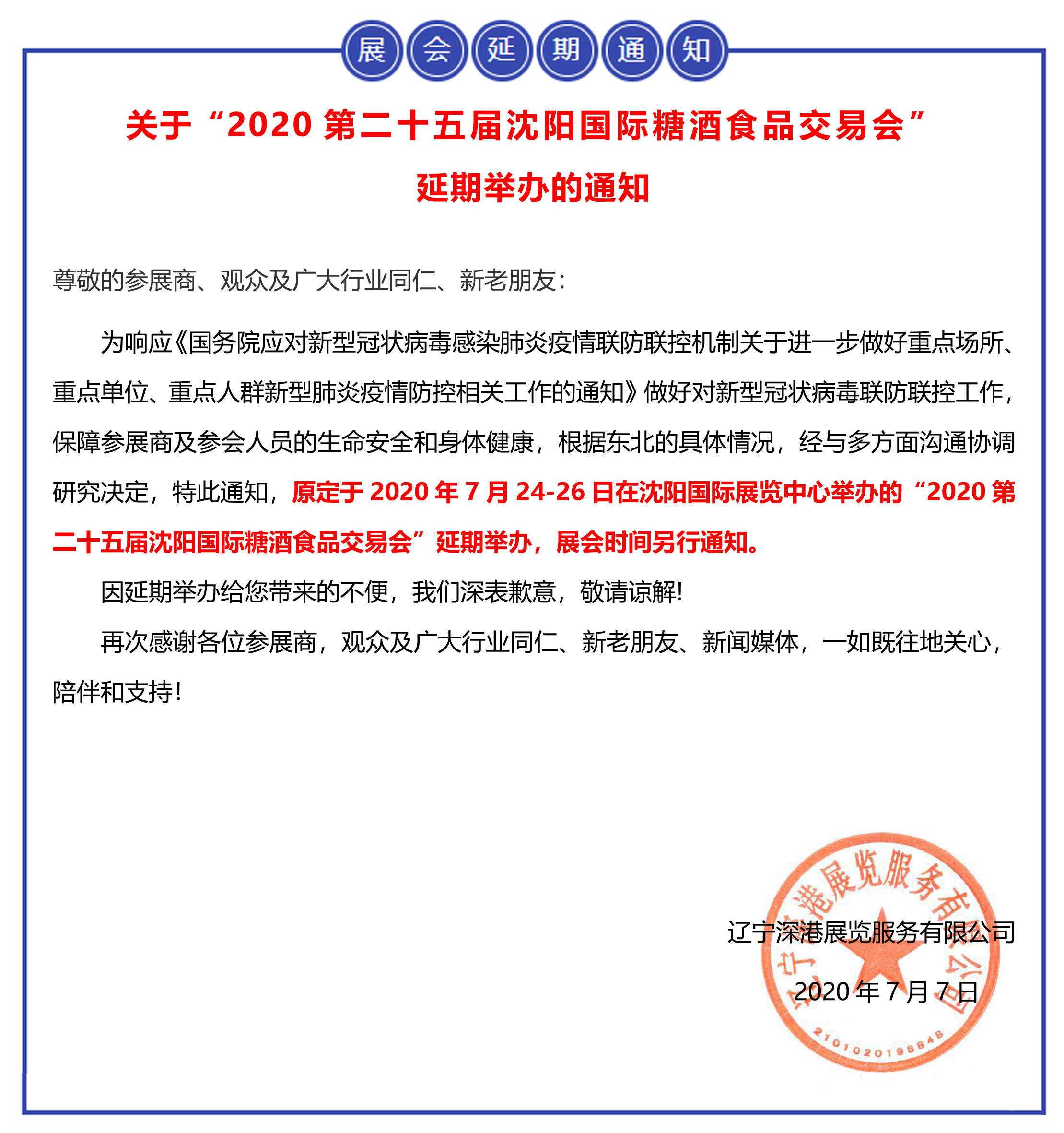 | 【重要通知】關(guān)于“2020第二十五屆沈陽國(guó)際糖酒食品交易會(huì)” 延期舉辦的通知 | |